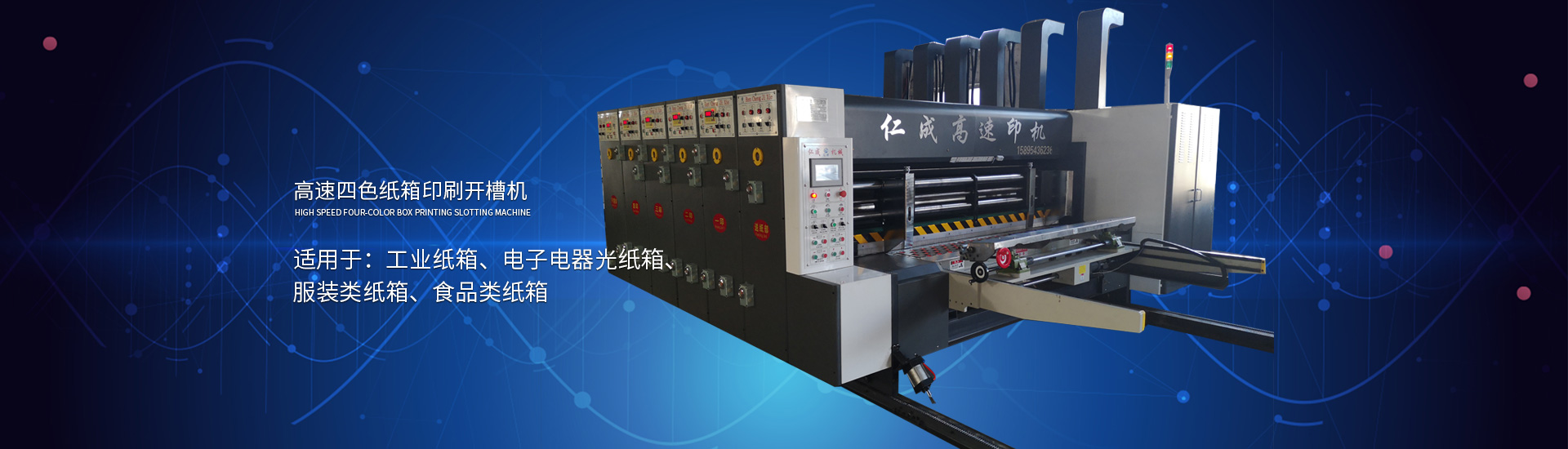 主要產品: 紙箱印刷開槽機, 高速印刷開槽模切機,自動插格機,釘箱機,粘箱機,仁成包裝機械,紙箱機械